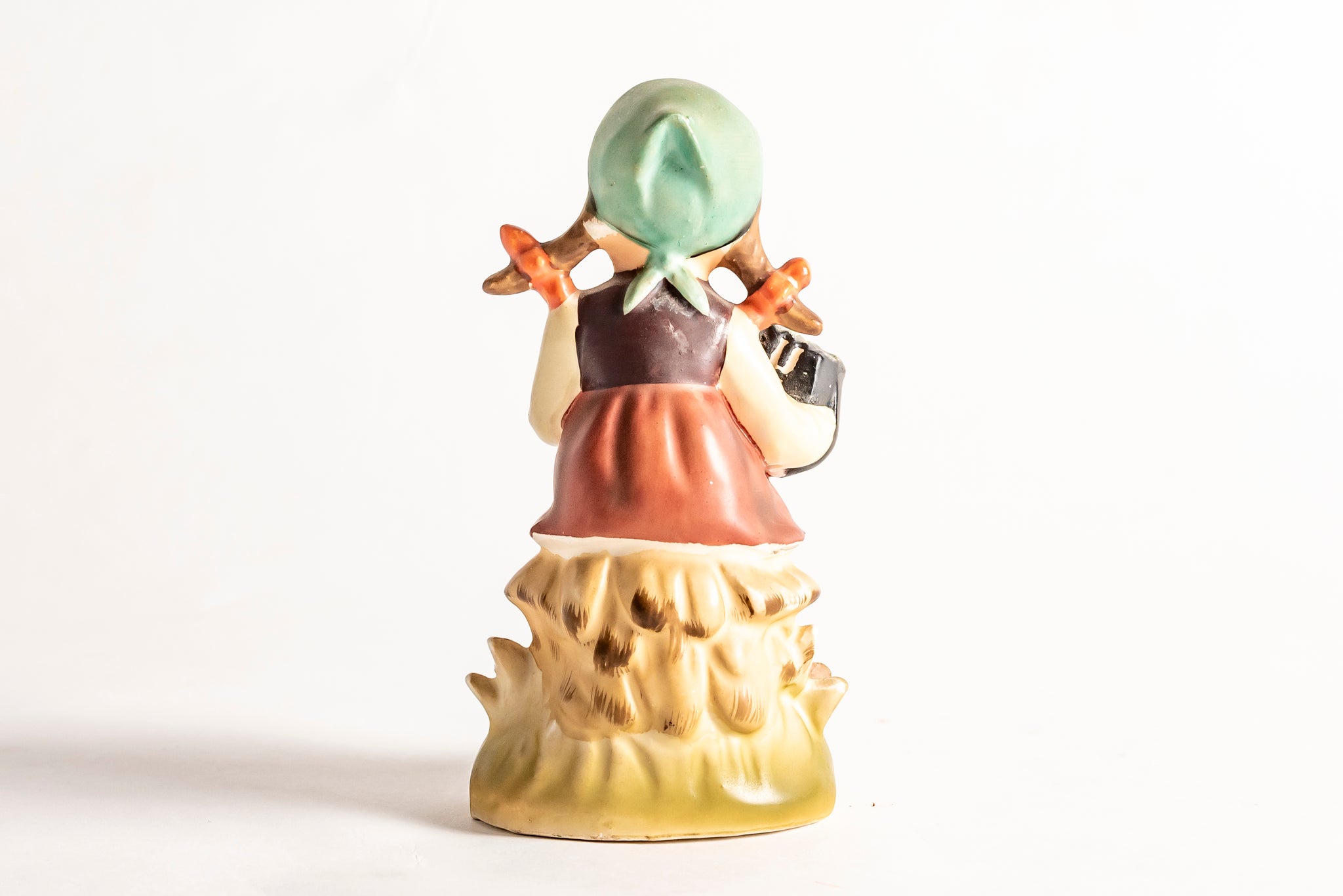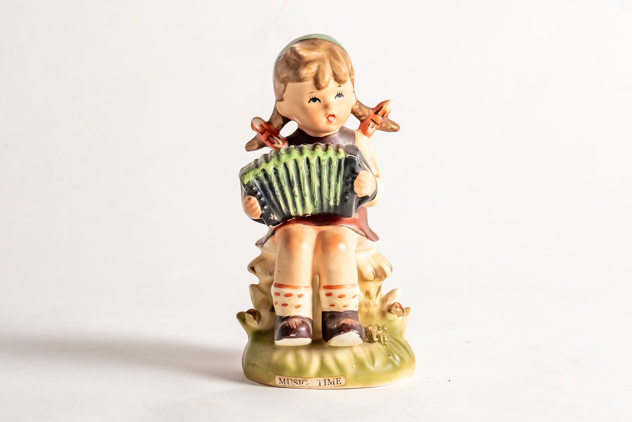 This is a vintage ERICH STAUFFER "Music Time" Accordion Girl Figurine. There is a "Music Time" label on the front. It is hand painted. Figurine is 6.5 inches tall by 3 inches across the base. The bottom of the base has "Designed by Erich Stauffer" U8543.